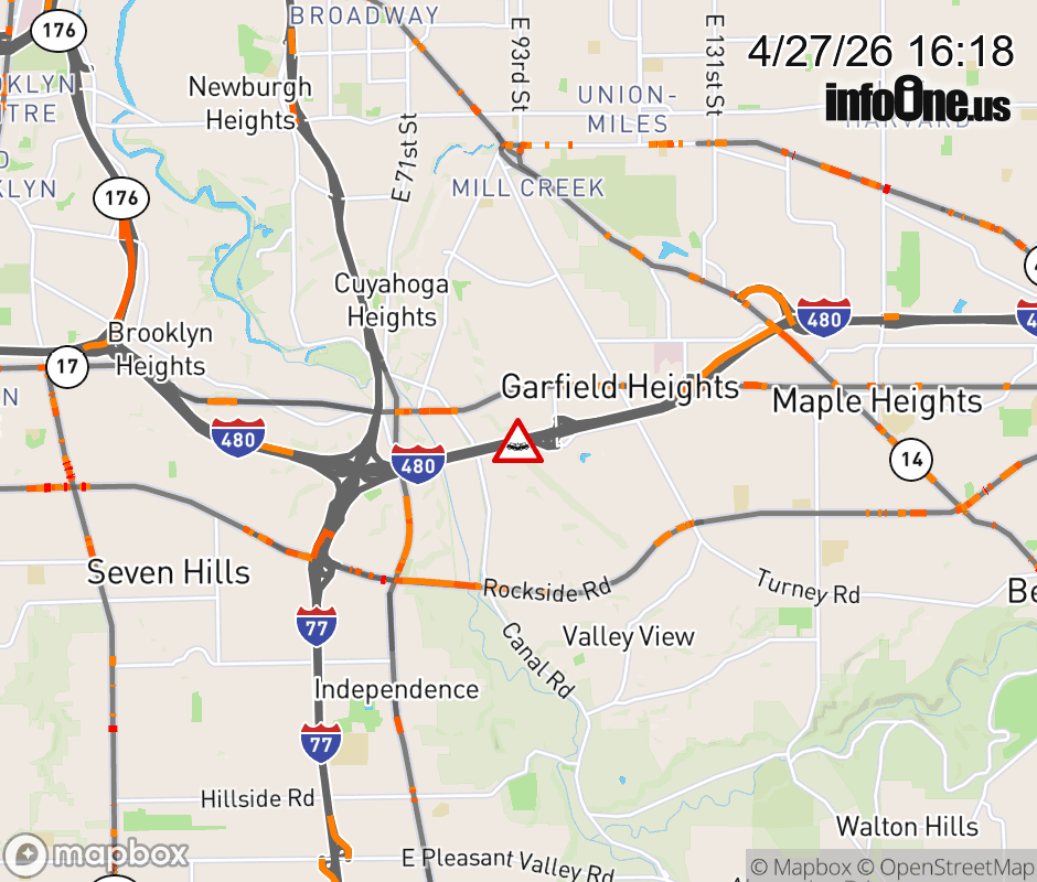 The left lane is blocked on I-480 West Express at Transportation Blvd/E 98th St, due to a crash. Updated: Mon 4/27/26 4:18 PM EDT ![]() Updated: Mon 4/27/26 4:18 PM EDT |