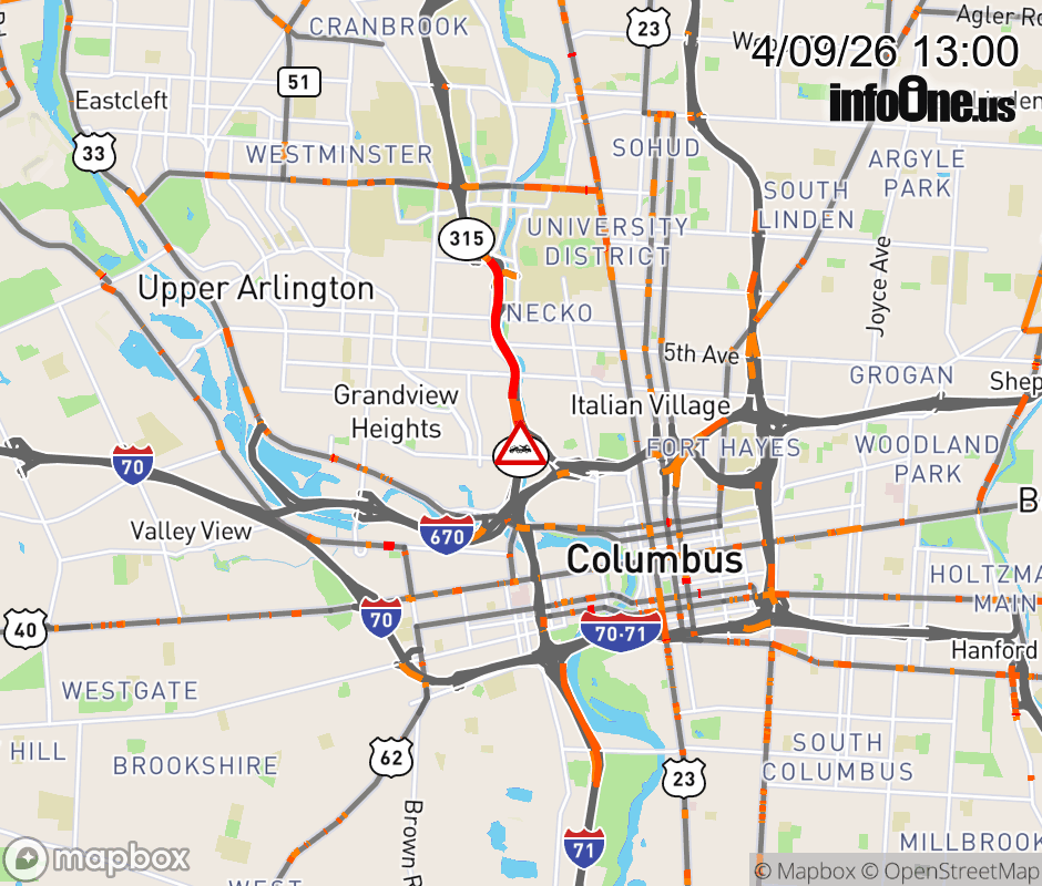 The right shoulder is closed on SR-315 South beyond I-670 East, due to a disabled vehicle. Updated: Thu 4/9/26 1:00 PM EDT ![]() Updated: Thu 4/9/26 1:00 PM EDT |