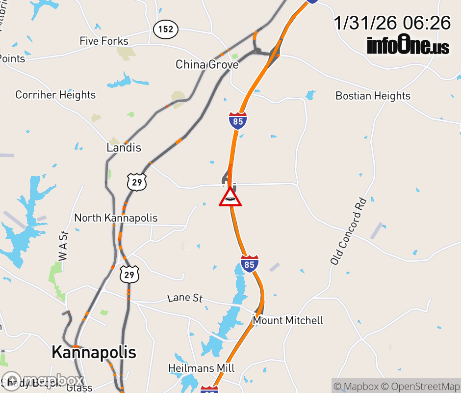 The left lane is closed at Exit 65 ( Old Beatty Ford Rd). Updated: Sat 1/31/26 6:26 AM EST ![]() Updated: Sat 1/31/26 6:26 AM EST |