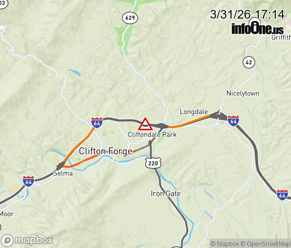 On I-64 at mile marker 27.2 in the County of Alleghany, motorists can expect delays due to a vehicle crash. The west right shoulder is closed. ![]() |