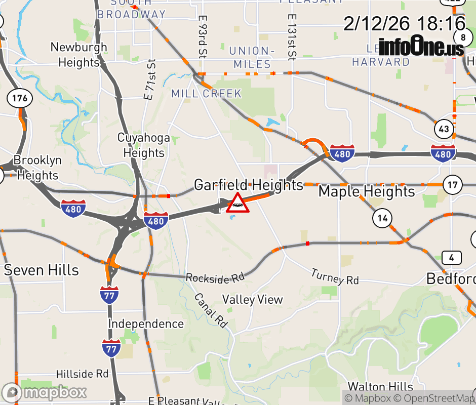 The 3 left lanes are blocked on I-480 East beyond Transportation Blvd/E 98th St, due to a crash. Updated: Thu 2/12/26 6:16 PM EST ![]() Updated: Thu 2/12/26 6:16 PM EST |