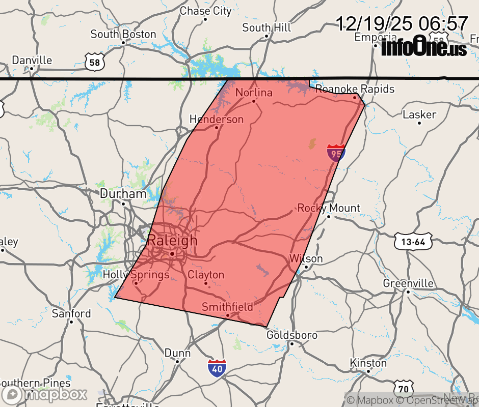 Canceled 12/19/25 7:22 AM Severe Thunderstorm Warning issued December 19 at 6:56AM EST until December 19 at 8:00AM EST by NWS Raleigh NC SVRRAH The National Weather Service in Raleigh has issued a * Severe Thunderstorm Warning for... Vance County in central North Carolina... Warren County in central North Carolina... Nash County in central North Carolina... Southeastern Granville County in central North Carolina... Northwestern Halifax County in central North Carolina... Wake County in central North Carolina... Western Wilson County in central North Carolina... Central Johnston County in central North Carolina... Franklin County in central North Carolina... * Until 800 AM EST. * At 655 AM EST, severe thunderstorms were located along a line extending from 7 miles northwest of Norlina to near Kittrell to near Creedmoor to near Raleigh to 6 miles west of Fuquay-Varina, moving east at 40 mph. HAZARD...60 mph wind gusts. SOURCE...Radar indicated. IMPACT...Expect damage to roofs, siding, and trees. * Locations impacted include... Raleigh, Cary, Rocky Mount, Roanoke Rapids, Henderson, Smithfield, Nashville, Louisburg, Warrenton, and Wilson. This includes the following highways... Interstate 95 between Mile Markers 173 and 95. Interstate 85 between Mile Markers 208 and 233. Interstate 40 between Mile Markers 287 and 317. Interstate 440 between Mile Markers 1 and 16. Interstate 540 between Mile Markers 5 and 24. US 1 between Mile Markers 94 and 101. NC Highway 264 between Mile Markers 20 and 38. ![]() |