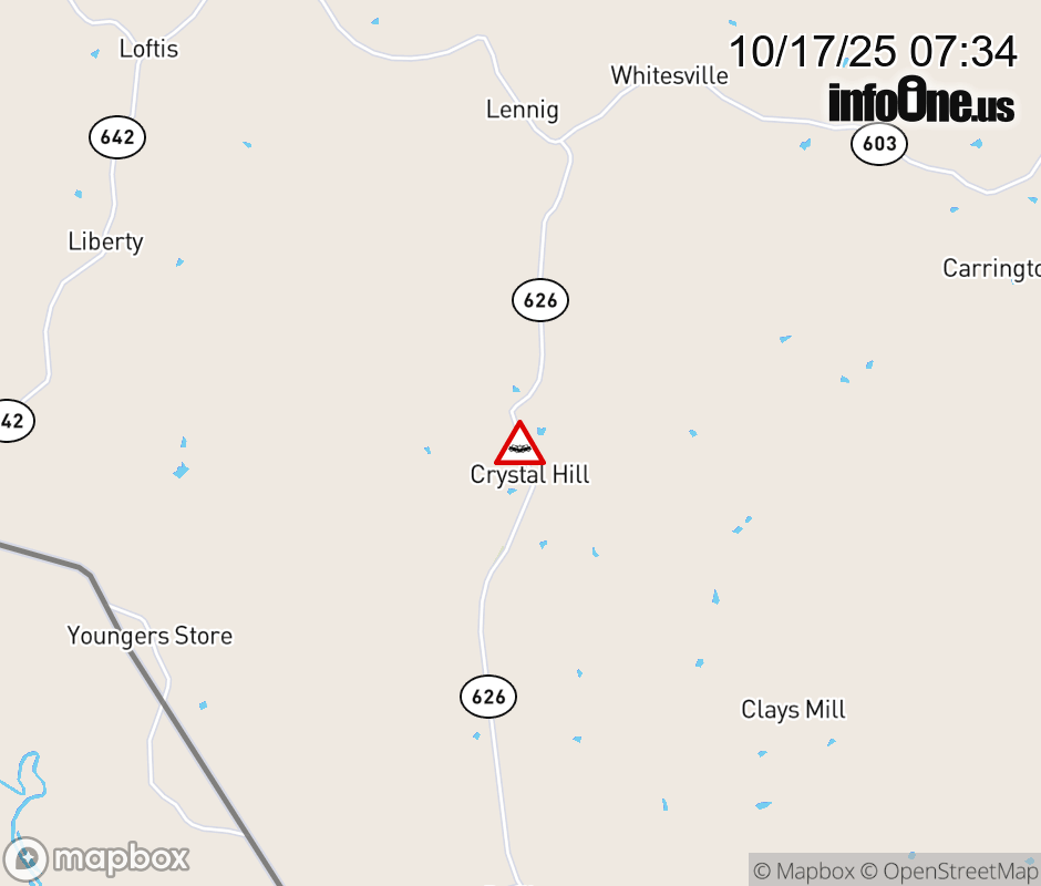 On Rt. 626 in the County of Halifax, in the vicinity of Crystal Hill Rd; Rt. 610N/S (Halifax County), motorists can expect delays due to a vehicle crash. All east lanes are closed. Updated: Fri 10/17/25 7:34 AM EDT ![]() Updated: Fri 10/17/25 7:34 AM EDT |