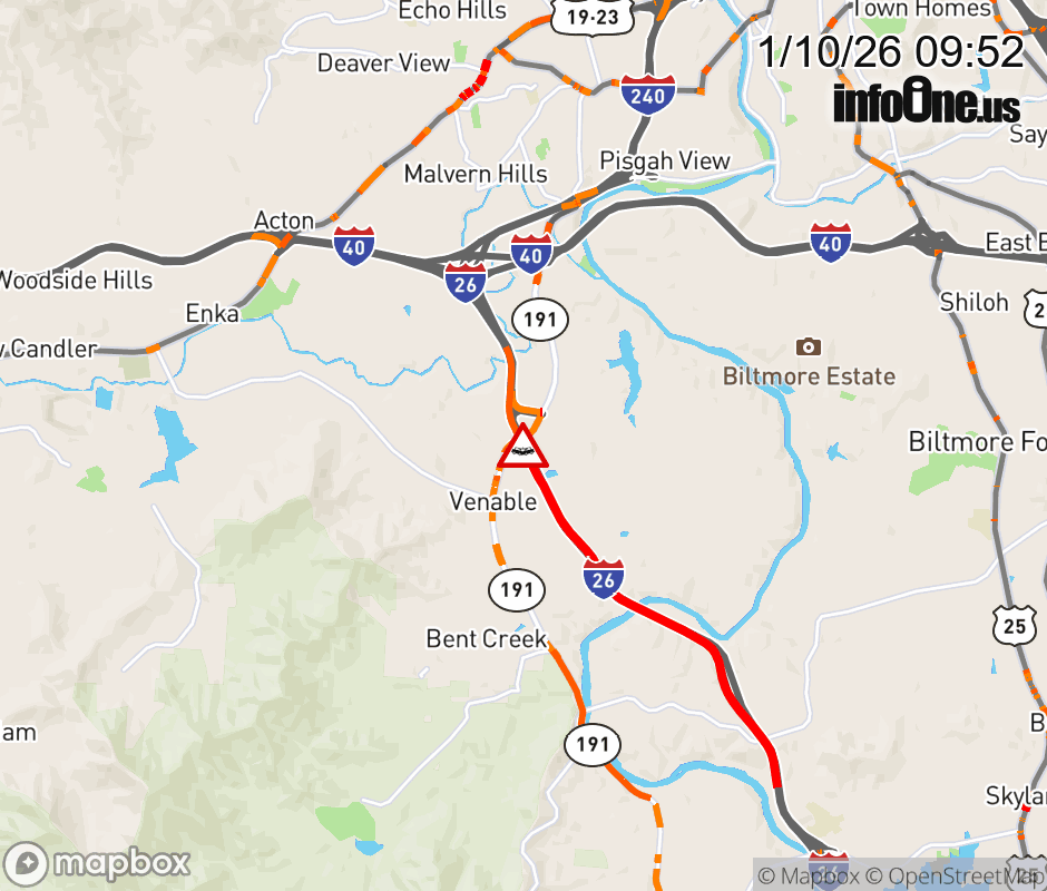 The road is closed at Exit 33 (NC 191/Brevard Rd). Updated: Sat 1/10/26 9:52 AM EST ![]() Updated: Sat 1/10/26 9:52 AM EST |