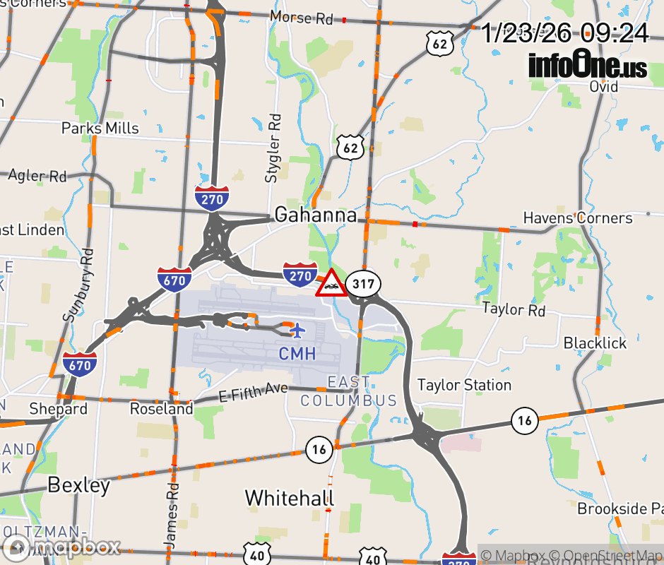 The right shoulder is blocked on I-270 North beyond SR-317/Hamilton Rd, due to a disabled vehicle. Updated: Fri 1/23/26 9:24 AM EST ![]() Updated: Fri 1/23/26 9:24 AM EST |