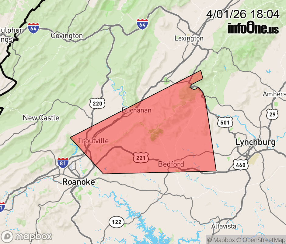 Canceled 4/1/26 6:37 PM Severe Thunderstorm Warning issued April 1 at 6:03PM EDT until April 1 at 6:45PM EDT by NWS Blacksburg VA At 602 PM EDT, a severe thunderstorm was located over Troutville, moving northeast at 20 mph. Other strong storms were located near Sedalia. HAZARD...60 mph wind gusts and quarter size hail. SOURCE...Radar indicated. IMPACT...Hail damage to vehicles is expected. Expect wind damage to roofs, siding, and trees. Locations impacted include... Bedford... Buchanan... Glasgow... Troutville... Big Island... Montvale... and Snowden. ![]() |