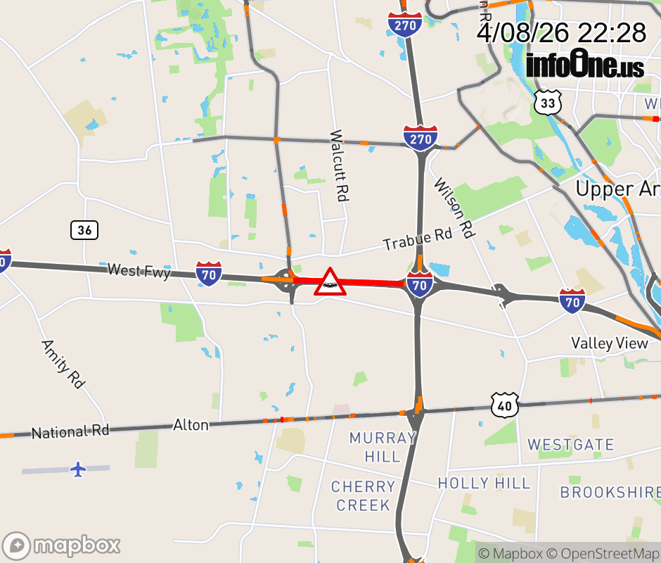 The left lane is blocked on I-70 West beyond I-270 (West Side), due to a crash. ![]() |