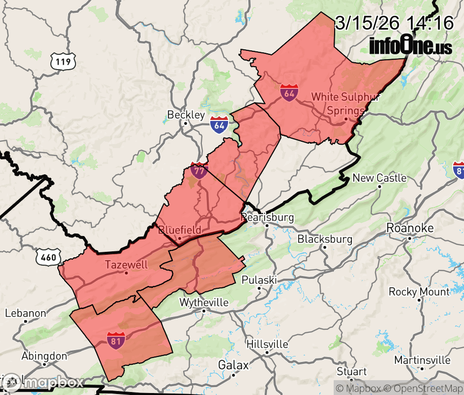 Canceled 3/15/26 9:07 PM Wind Advisory issued March 15 at 2:14PM EDT until March 16 at 11:00AM EDT by NWS Blacksburg VA * WHAT... South winds 15 to 25 mph with gusts up to 50 mph expected. * WHERE... In Virginia, Bland, Smyth, and Tazewell Counties. In West Virginia, Mercer, Summers, and Western Greenbrier Counties. * WHEN... From midnight tonight to 11 AM EDT Monday. * IMPACTS... Gusty winds will blow around unsecured objects. Tree limbs could be blown down and a few power outages may result. ![]() |