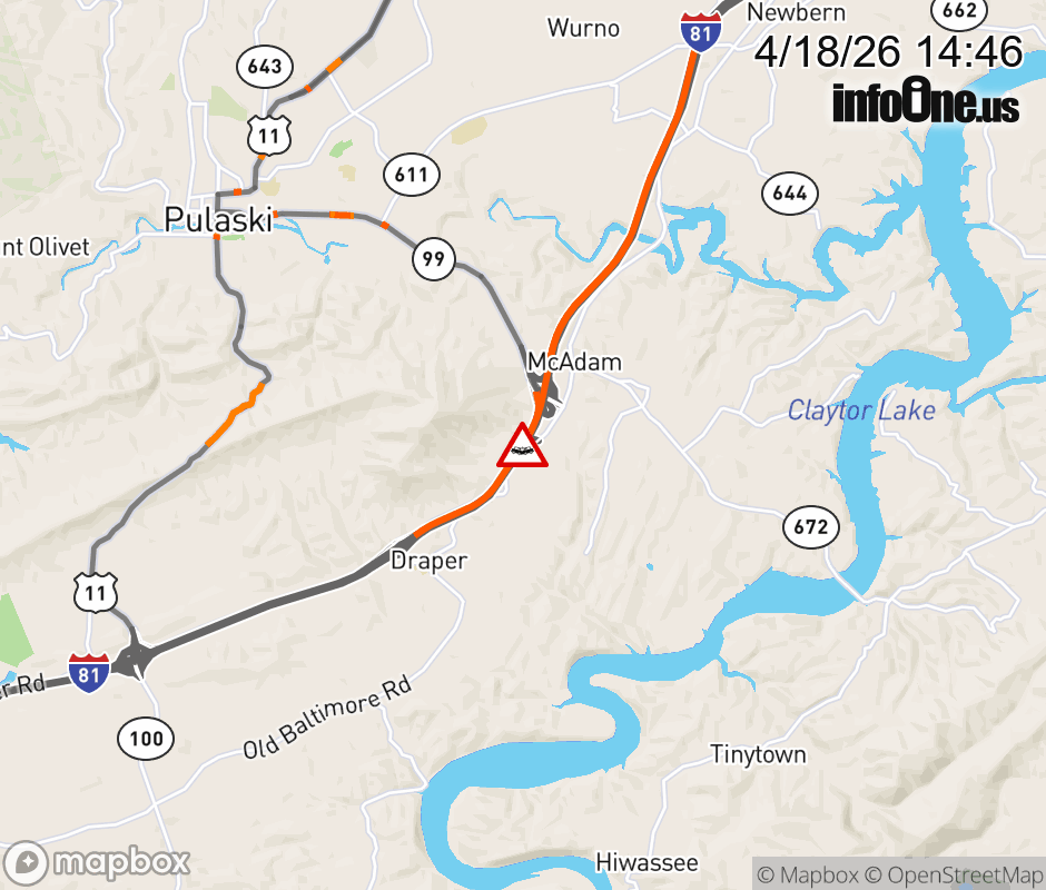 On I-81 at mile marker 93.9 in the County of Pulaski, motorists can expect delays due to a tractor trailer crash. The south right shoulder is closed. Updated: Sat 4/18/26 2:46 PM EDT ![]() Updated: Sat 4/18/26 2:46 PM EDT |