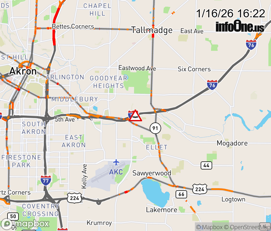 The 2 right lanes are blocked on I-76 East beyond SR-18/E Market St, due to a crash. Updated: Fri 1/16/26 4:22 PM EST ![]() Updated: Fri 1/16/26 4:22 PM EST |