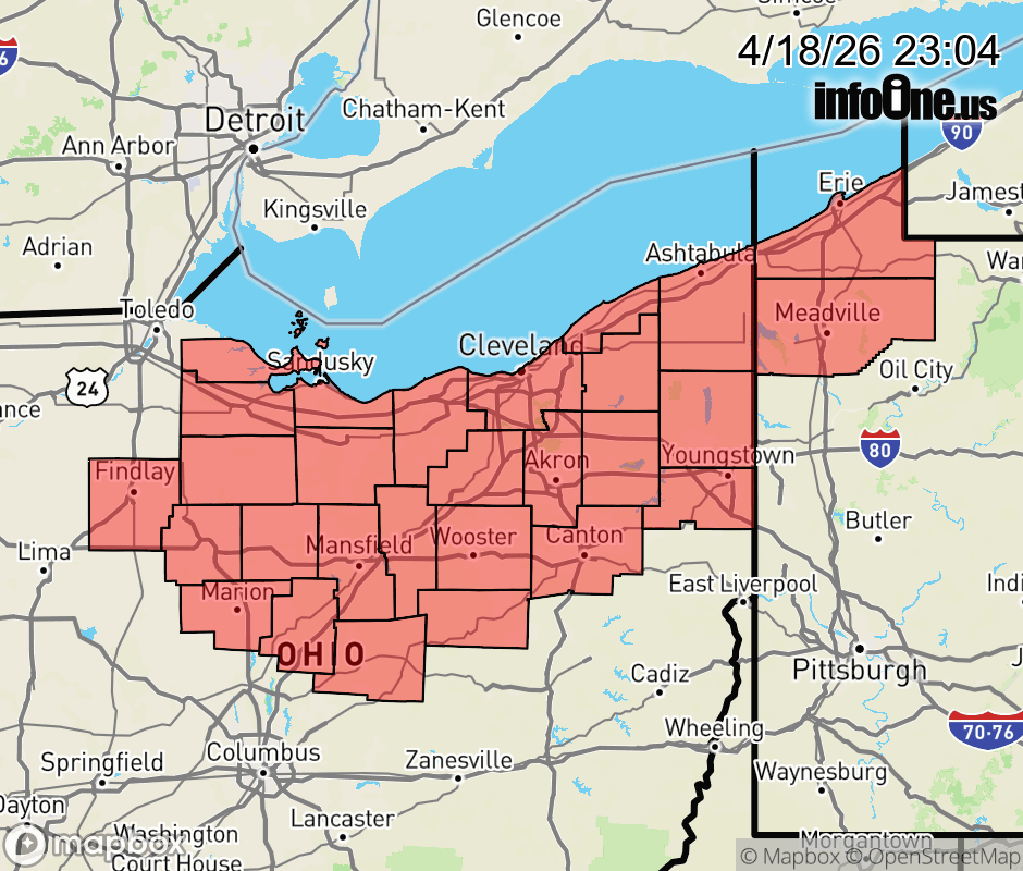 Canceled 4/19/26 12:50 AM Freeze Watch issued April 18 at 11:03PM EDT until April 20 at 11:00AM EDT by NWS Cleveland OH * WHAT... Sub-freezing temperatures in the lower 20's to lower 30's are possible. * WHERE... Portions of north central, northeast, and northwest Ohio and northwest Pennsylvania. * WHEN... From Sunday evening through Monday morning. * IMPACTS... Frost and freeze conditions could kill crops, other sensitive vegetation and possibly damage unprotected outdoor plumbing. * ADDITIONAL DETAILS... The coldest low temperatures and greatest potential for frost formation Sunday morning are expected in far-northern Wood County and the western two-thirds of Lucas County. ![]() |
