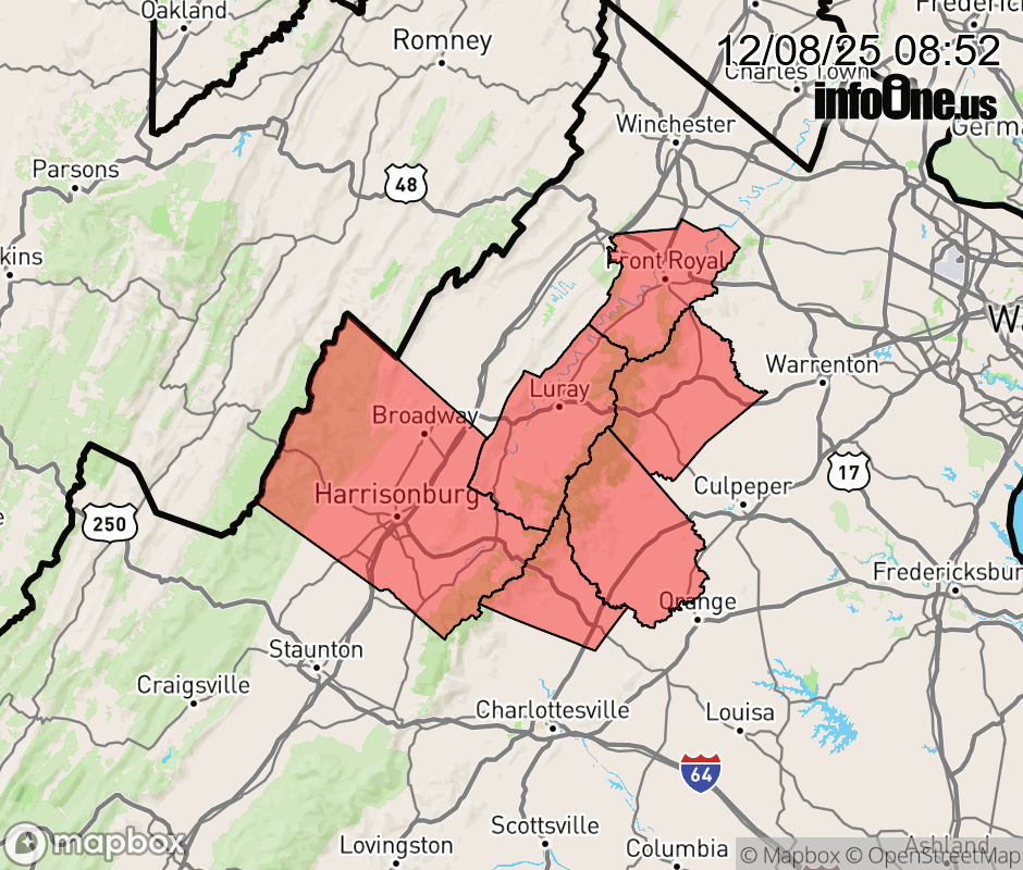 Canceled 12/8/25 4:53 PM Winter Weather Advisory issued December 8 at 8:50AM EST until December 8 at 5:00PM EST by NWS Baltimore MD/Washington DC * WHAT... Snow. Total snow accumulations between 1 and 2 inches, with locally up to 4 inches possible along the Blue Ridge Mountains. * WHERE... Greene County, and Northern Virginia Blue Ridge. * WHEN... Until 5 PM EST this afternoon. * IMPACTS... Plan on slippery road conditions. The hazardous conditions could impact the Monday evening commute. ![]() |