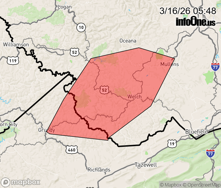 Canceled 3/16/26 6:02 AM Severe Thunderstorm Warning issued March 16 at 5:47AM EDT until March 16 at 6:15AM EDT by NWS Charleston WV At 547 AM EDT, severe thunderstorms were located along a line extending from near Hanover to 11 miles southeast of Argo to near Grundy, moving east at 35 mph. HAZARD...60 mph wind gusts. SOURCE...Radar indicated. IMPACT...Expect damage to roofs, siding, and trees. Locations impacted include... Welch, Grundy, Pineville, Mullens, Gary, War, Hanover, R.d. Bailey Lake, Gilbert Creek, Davy, Bradshaw, Iaeger, Kimball, Clear Fork, Panther, Jolo, Stacy, Coalwood, Avondale, and Wolf Pen. ![]() |