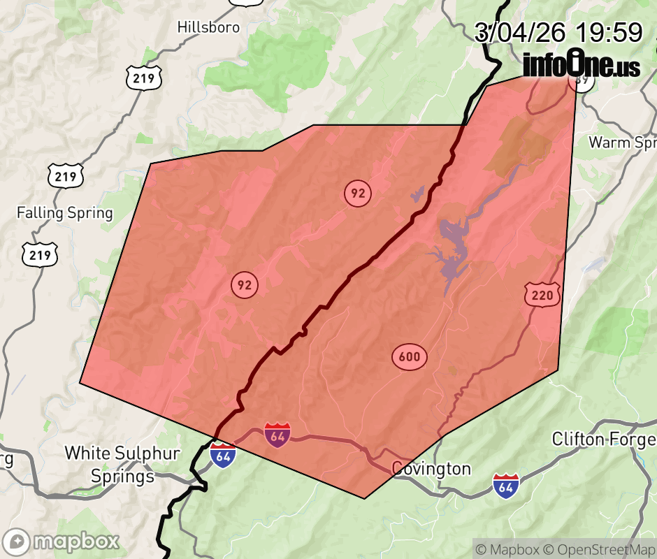 Canceled 3/4/26 8:30 PM Special Weather Statement issued March 4 at 7:58PM EST by NWS Blacksburg VA At 758 PM EST, Doppler radar was tracking a strong thunderstorm over Alvon, or near Neola, moving east at 40 mph. HAZARD...Wind gusts up to 40 mph and pea size hail. SOURCE...Radar indicated. IMPACT...Gusty winds could knock down tree limbs and blow around unsecured objects. Locations impacted include... Neola... Lake Moomaw... Mountain Grove... Carloover... Bacova Junction... Natural Well... and Alvon. ![]() |