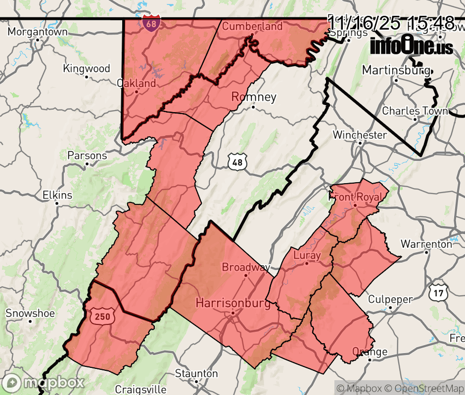 Canceled 11/16/25 5:12 PM Wind Advisory issued November 16 at 3:47PM EST until November 16 at 6:00PM EST by NWS Baltimore MD/Washington DC * WHAT... Northwest winds 20 to 30 mph with gusts up to 50 mph. * WHERE... Portions of western Maryland, northwest and western Virginia, and eastern West Virginia. * WHEN... Until 6 PM EST this evening. * IMPACTS... Gusty winds will blow around unsecured objects. Tree limbs could be blown down and a few power outages may result. ![]() |