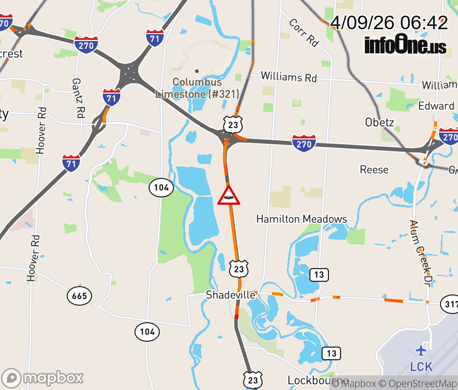 Expect lane closures on US-23 North beyond London Groveport Rd the left lane is closed on US-23 South beyond Rathmell Rd, due to a crash. Updated: Thu 4/9/26 6:42 AM EDT ![]() Updated: Thu 4/9/26 6:42 AM EDT |