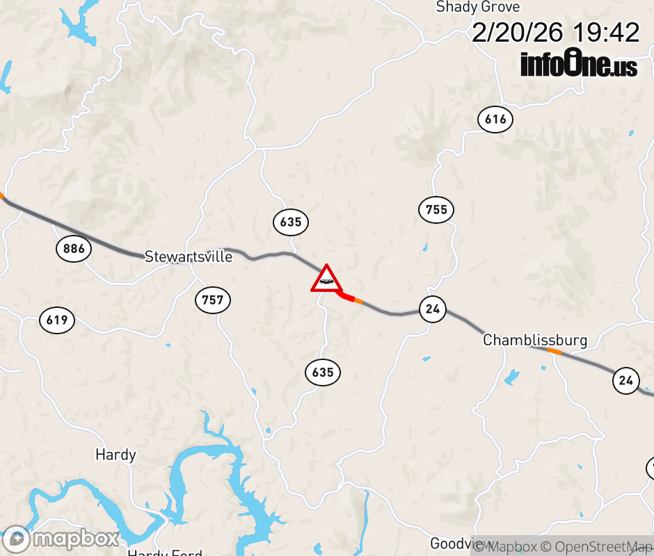 On VA-24 East in the County of Bedford, in the vicinity of Moles Farm Rd; Morgans Mill Rd; Spradlin Rd; Rt. 635N/S (Bedford County); / SPALDIN RD, motorists can expect delays due to a vehicle crash. Lane closures exist. ![]() |