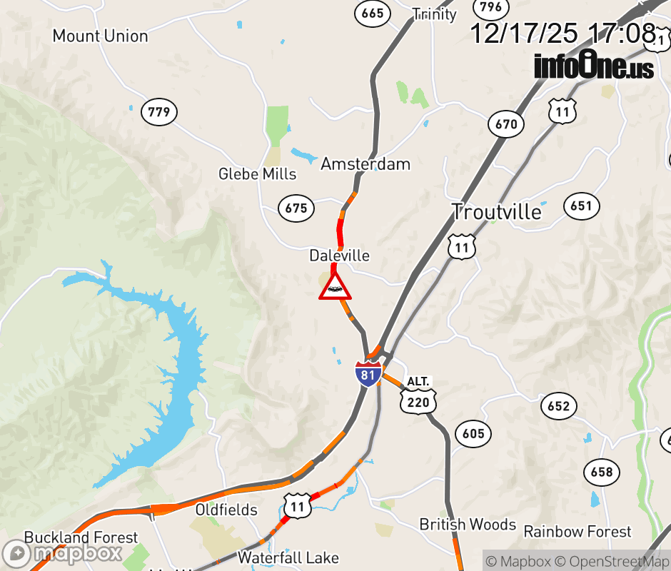 On US-220 South in the County of Botetourt, in the vicinity of Rt. 9052N/S (Botetourt County), motorists can expect delays due to a multi-vehicle crash. Lane closures exist. ![]() |