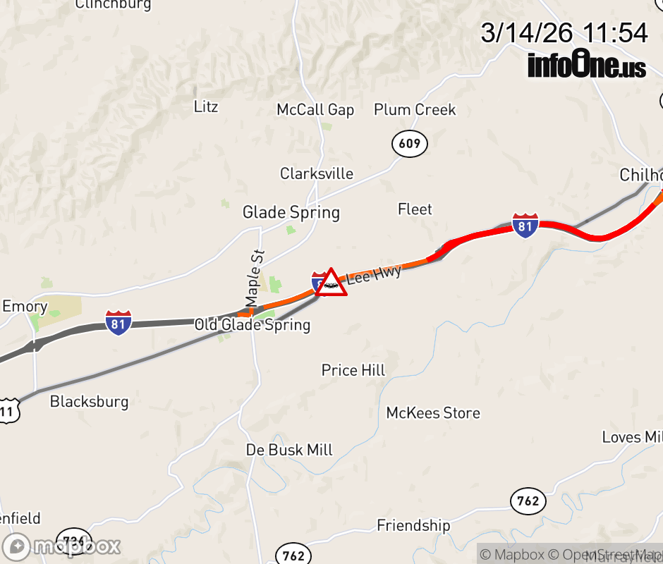On I-81 South at mile marker 30.5 in the County of Washington, motorists can expect delays due to a vehicle crash. Traffic backups are approximately 1.0 mile. Updated: Sat 3/14/26 11:54 AM EDT ![]() Updated: Sat 3/14/26 11:54 AM EDT |