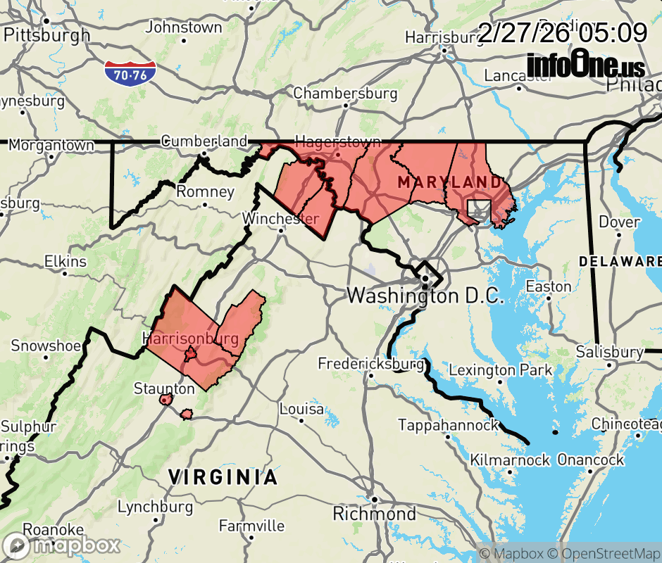 Canceled 2/27/26 8:35 AM Freezing Fog Advisory issued February 27 at 5:07AM EST until February 27 at 9:00AM EST by NWS Baltimore MD/Washington DC * WHAT... Visibility one quarter mile or less in freezing fog. * WHERE... In Maryland, Carroll, Frederick, Washington, and Northern Baltimore Counties. In Virginia, Page, Augusta, and Rockingham Counties. In West Virginia, Berkeley and Jefferson Counties. * WHEN... Until 9 AM EST this morning. * IMPACTS... Low visibility could make driving conditions hazardous. Freezing fog and any residual moisture from Thursday's rain may result in icy patches. ![]() |