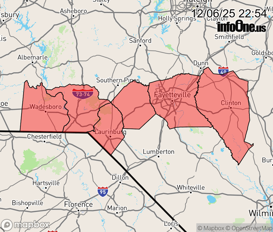 Canceled 12/6/25 10:55 PM Dense Fog Advisory issued December 6 at 10:50PM EST until December 7 at 8:00AM EST by NWS Raleigh NC * WHAT... Visibility one quarter mile or less in dense fog. * WHERE... Anson, Cumberland, Hoke, Richmond, Sampson, and Scotland Counties. * WHEN... Until 8 AM EST Sunday. * IMPACTS... Low visibility could make driving conditions hazardous. * ADDITIONAL DETAILS... Patchy freezing fog may also occur late tonight through early Sunday morning. Some bridges and overpasses may become slippery due to black ice. ![]() |