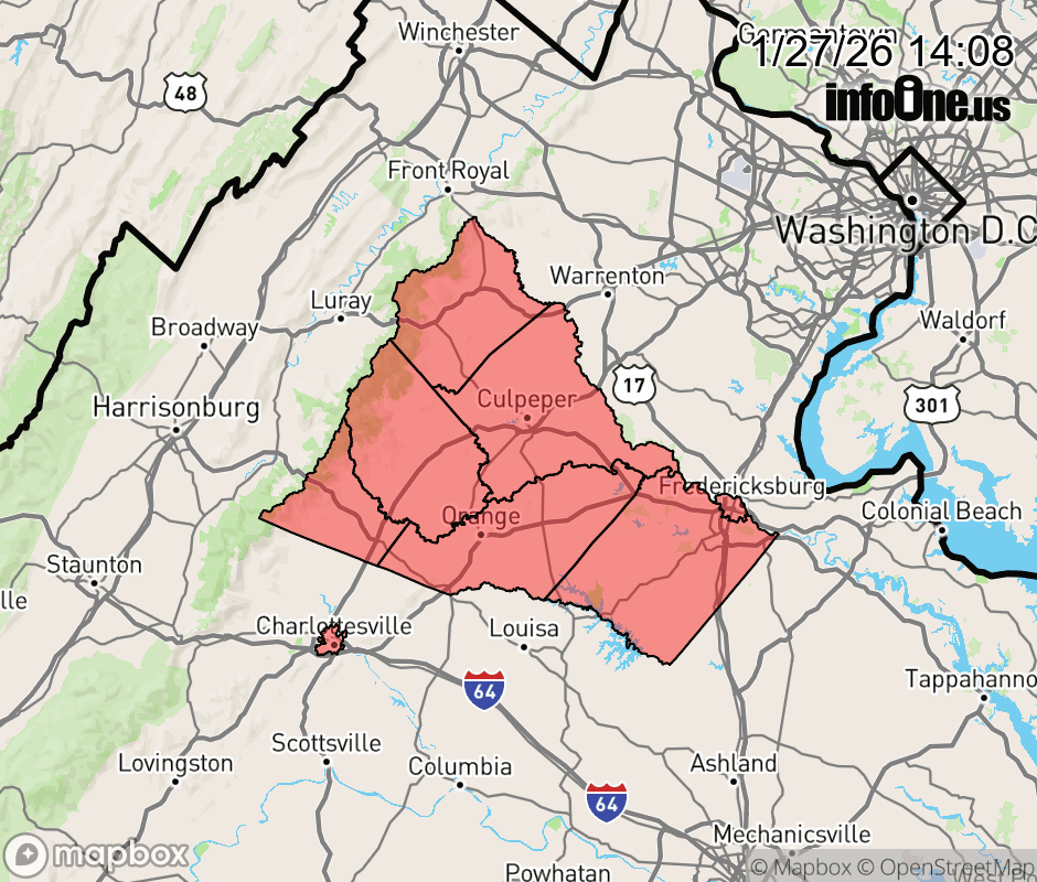 Canceled 1/27/26 9:58 PM Cold Weather Advisory issued January 27 at 2:06PM EST until January 28 at 11:00AM EST by NWS Baltimore MD/Washington DC * WHAT... Very cold wind chills around zero expected. * WHERE... Albemarle, Greene, Orange, Spotsylvania, Culpeper, Madison, and Rappahannock Counties. * WHEN... From 7 PM this evening to 11 AM EST Wednesday. * IMPACTS... Frostbite and hypothermia will occur if unprotected skin is exposed to these temperatures. * ADDITIONAL DETAILS... Additional Cold Weather Headlines are expected at times through the end of the week as the region remains in an Arctic Airmass. ![]() |