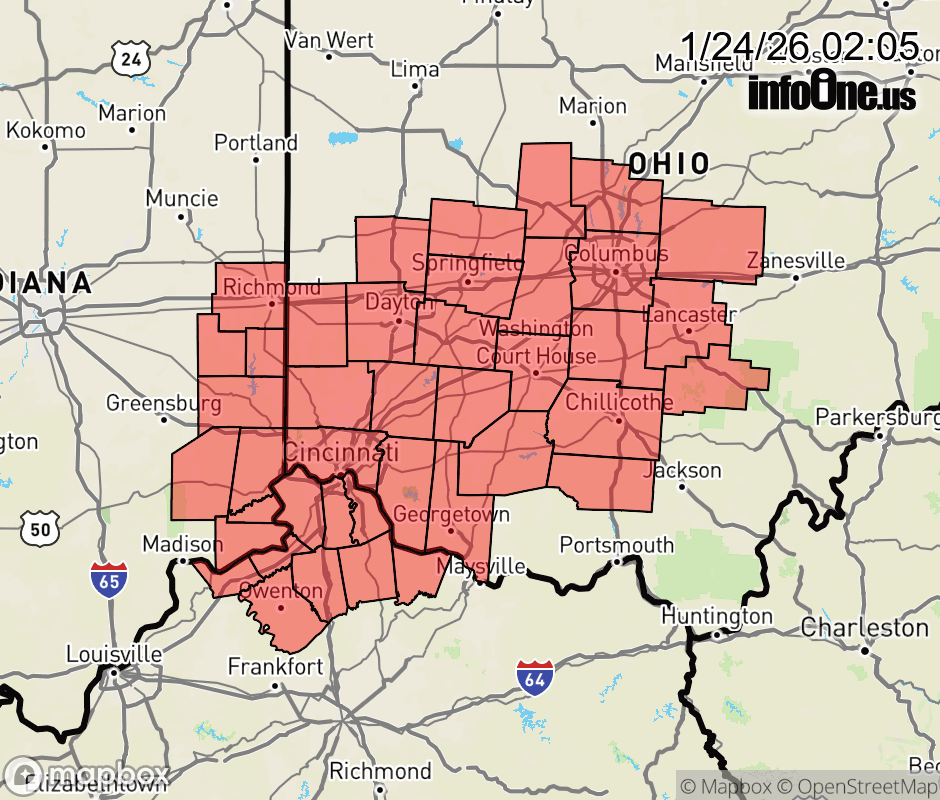 Canceled 1/24/26 2:17 AM Winter Storm Warning issued January 24 at 2:04AM EST until January 26 at 12:00PM EST by NWS Wilmington OH * WHAT... Heavy snow expected. Total snow accumulations between 8 and 12 inches. * WHERE... Portions of east central and southeast Indiana, northern Kentucky, and central, south central, southwest, and west central Ohio. * WHEN... From 10 AM this morning to noon EST Monday. * IMPACTS... Travel could be very difficult. The hazardous conditions could impact the Monday morning commute. ![]() |