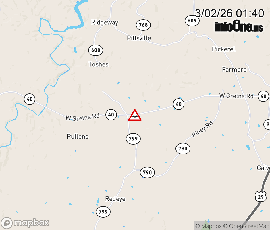 On VA-40 in the County of Pittsylvania, in the vicinity of Climax Rd; Rt. 799N/S (Pittsylvania County), motorists can expect delays due to a vehicle crash. All west lanes are closed. ![]() |