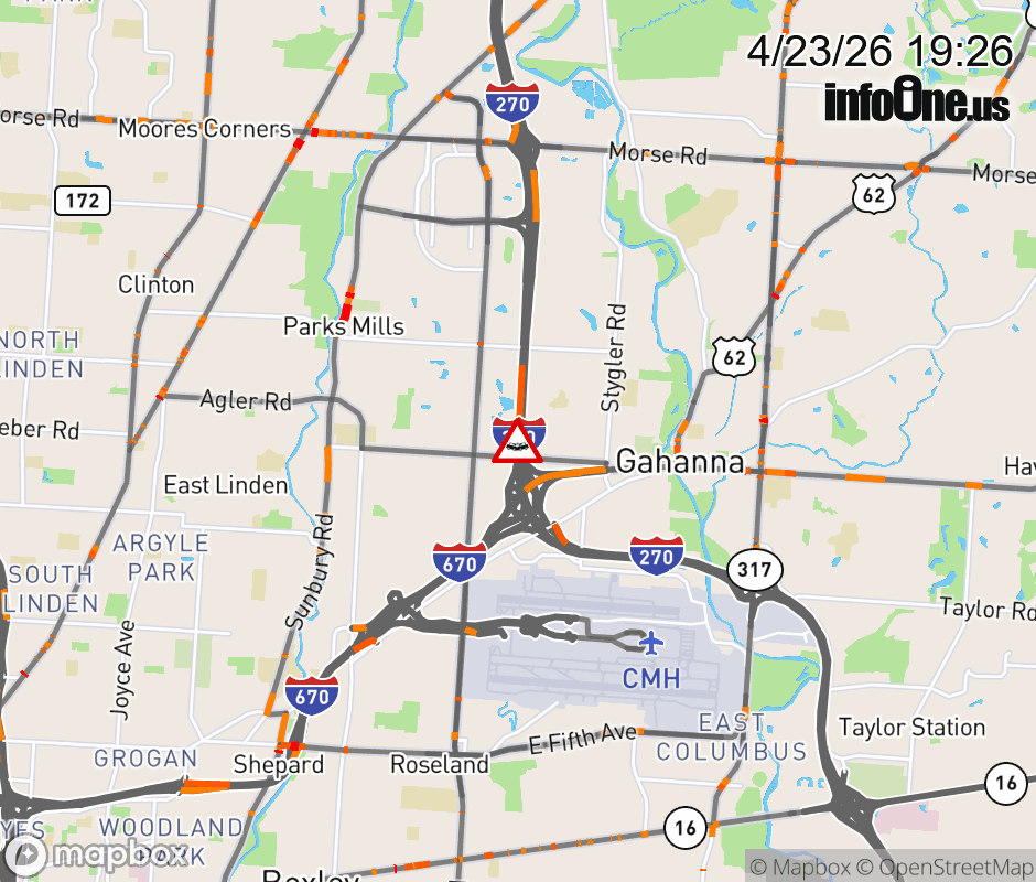 The 2 left lanes are blocked on I-270 South at I-670 West, due to a crash. Updated: Thu 4/23/26 7:26 PM EDT ![]() Updated: Thu 4/23/26 7:26 PM EDT |