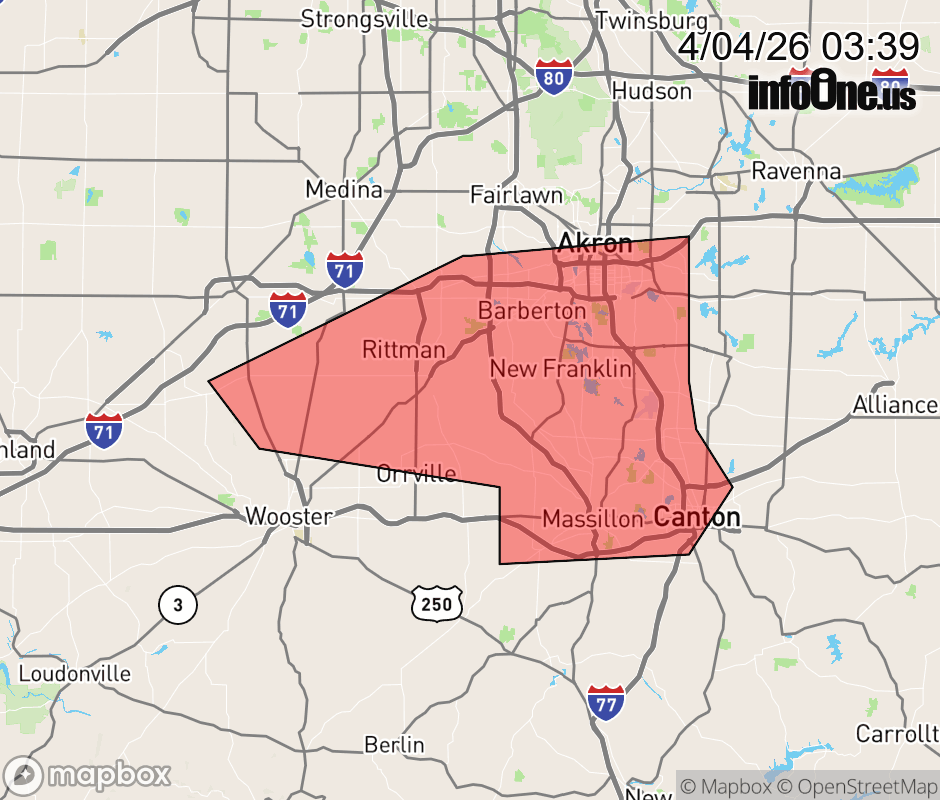 Canceled 4/4/26 6:45 AM Flood Advisory issued April 4 at 3:37AM EDT until April 4 at 6:45AM EDT by NWS Cleveland OH * WHAT... Flooding caused by excessive rainfall is expected. * WHERE... A portion of northeast Ohio, including the following counties, Medina, Stark, Summit and Wayne. * WHEN... Until 645 AM EDT. * IMPACTS... Minor flooding in low-lying and poor drainage areas. * ADDITIONAL DETAILS... - At 337 AM EDT, Doppler radar indicated heavy rain due to thunderstorms. Minor flooding is ongoing or expected to begin shortly in the advisory area. Between 1 and 2 inches of rain have fallen. - Additional rainfall amounts of 0.5 to 1 inch are expected over the area. This additional rain will result in minor flooding. - Some locations that will experience flooding include... Akron, Canton, Wooster, Massillon, Barberton, Green, Wadsworth, Tallmadge, North Canton, Orrville, Rittman, Mogadore, Doylestown, Creston, New Franklin, Norton, Canal Fulton, Lakemore, Seville and Smithville. - Please visit www.weather.gov/safety/flood for flood safety and preparedness information. ![]() |