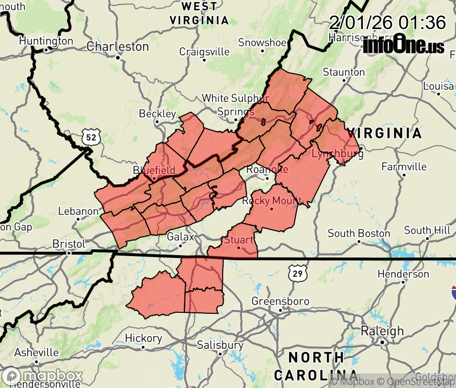 Canceled 2/1/26 9:55 AM Extreme Cold Warning issued February 1 at 1:35AM EST until February 1 at 1:00PM EST by NWS Blacksburg VA * WHAT... Dangerously cold wind chills as low as 16 below. * WHERE... Portions of north central and northwest North Carolina, central, south central, southwest, and west central Virginia, and southeast West Virginia. * WHEN... Until 1 PM EST this afternoon. * IMPACTS... The cold wind chills as low as 15 below zero could result in hypothermia or frostbite if precautions are not taken. Frostbite and hypothermia will occur if unprotected skin is exposed to these temperatures. ![]() |