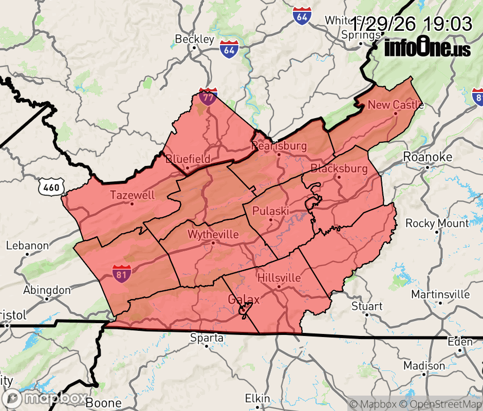 Canceled 1/30/26 2:26 AM Winter Storm Warning issued January 29 at 7:01PM EST until February 1 at 1:00PM EST by NWS Blacksburg VA * WHAT... Heavy snow expected. Total snow accumulations between 4 and 8 inches. Winds gusting as high as 50 mph. * WHERE... Portions of southwest Virginia and southeast West Virginia. * WHEN... From 7 AM Friday to 1 PM EST Sunday. * IMPACTS... Travel could be very difficult. The hazardous conditions could impact the Friday morning and evening commutes. Gusty winds could bring down tree branches. * ADDITIONAL DETAILS... Strong winds Saturday night into Sunday will result in blowing and drifting snow...reducing visibility at times. ![]() |