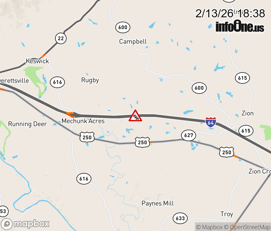 On I-64 West at mile marker 131.8 in the County of Louisa, motorists can expect delays due to other security/police activity. Updated: Fri 2/13/26 6:38 PM EST ![]() Updated: Fri 2/13/26 6:38 PM EST |