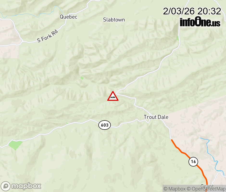 On Rt. 741 in the County of Grayson, in the vicinity of Troutdale Hwy; VA-16N/S, motorists can expect delays due to a disabled tractor trailer. All north lanes are closed. All south lanes are closed. Updated: Tue 2/3/26 8:32 PM EST ![]() Updated: Tue 2/3/26 8:32 PM EST |