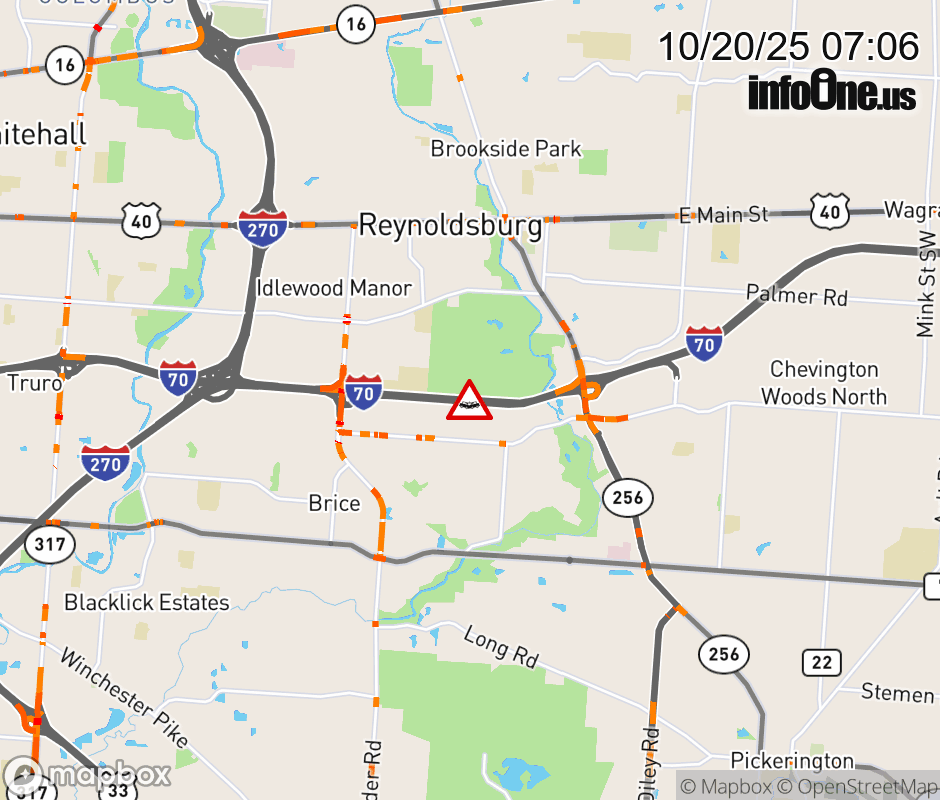 The left shoulder is blocked on I-70 West beyond SR-256, due to a crash. Updated: Mon 10/20/25 7:06 AM EDT ![]() |