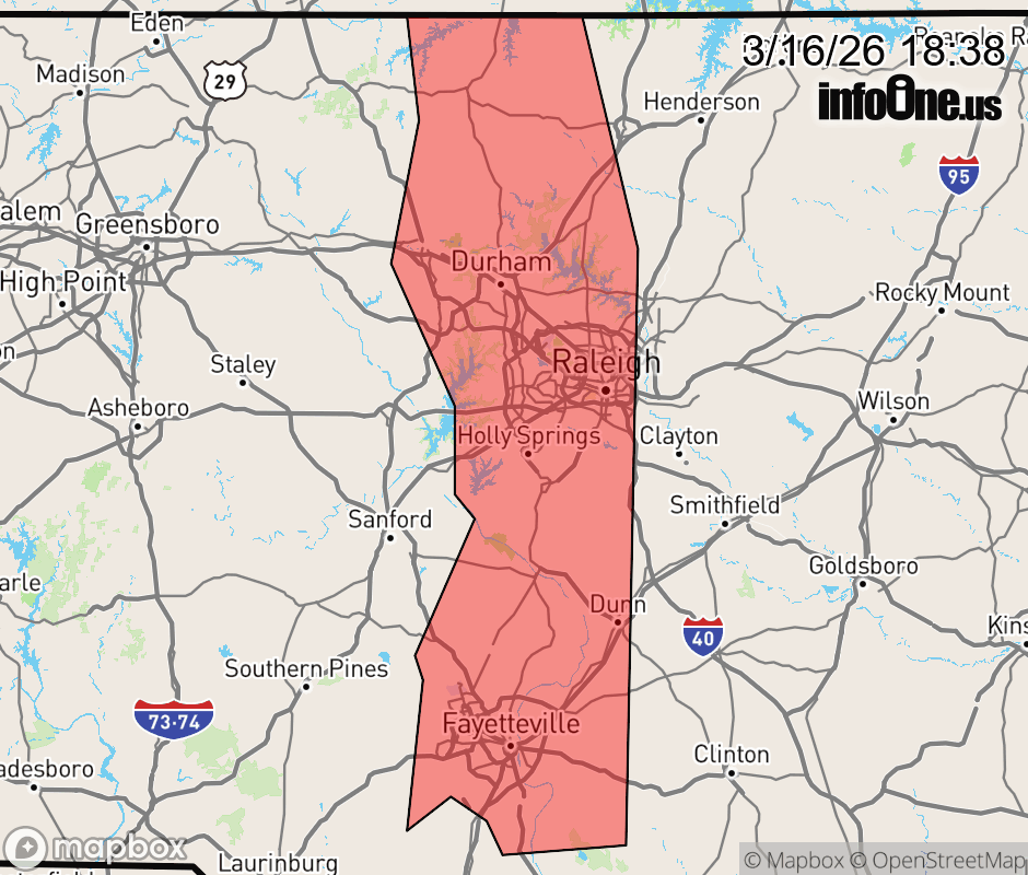 Canceled 3/16/26 6:45 PM Severe Thunderstorm Warning issued March 16 at 6:37PM EDT until March 16 at 6:45PM EDT by NWS Raleigh NC At 637 PM EDT, severe thunderstorms were located along a line extending from near Roxboro to Durham to near Fayetteville, moving east at 45 mph. HAZARD...60 mph wind gusts. SOURCE...Radar indicated. IMPACT...Expect damage to roofs, siding, and trees. Locations impacted include... Raleigh, Durham, Fayetteville, Cary, Chapel Hill, Roxboro, Hillsborough, Creedmoor, Lillington, and Fort Bragg. This includes the following highways... Interstate 95 between Mile Markers 73 and 41. Interstate 85 between Mile Markers 163 and 200. Interstate 40 between Mile Markers 161 and 162, between Mile Markers 259 and 306, and between Mile Markers 314 and 316. Interstate 440 between Mile Markers 1 and 16. Interstate 540 between Mile Markers 0 and 17. US 1 between Mile Markers 84 and 101. the Durham Freeway between Mile Markers 2 and 17. ![]() |