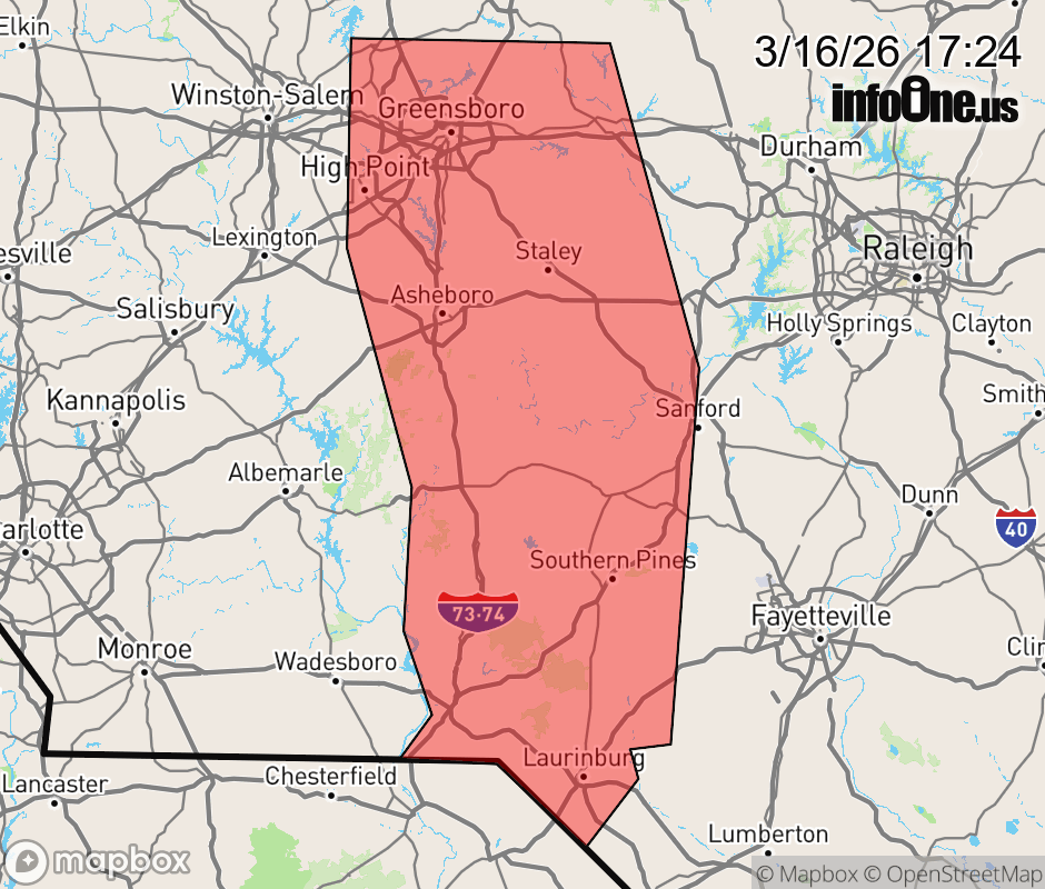 Canceled 3/16/26 5:52 PM Severe Thunderstorm Warning issued March 16 at 5:23PM EDT until March 16 at 6:15PM EDT by NWS Raleigh NC SVRRAH The National Weather Service in Raleigh has issued a * Severe Thunderstorm Warning for... Alamance County in central North Carolina... Moore County in central North Carolina... Scotland County in central North Carolina... Eastern Montgomery County in central North Carolina... Richmond County in central North Carolina... Randolph County in central North Carolina... Guilford County in central North Carolina... Western Lee County in central North Carolina... Western Hoke County in central North Carolina... Western Chatham County in central North Carolina... * Until 615 PM EDT. * At 523 PM EDT, severe thunderstorms were located along a line extending from near Walnut Cove to near Biscoe to 7 miles north of Wallace, moving east at 50 mph. HAZARD...60 mph wind gusts. SOURCE...Radar indicated. IMPACT...Expect damage to roofs, siding, and trees. * Locations impacted include... Greensboro, High Point, Burlington, Sanford, Asheboro, Laurinburg, Graham, Southern Pines, Rockingham, and Raeford. This includes the following highways... Interstate 85 between Mile Markers 33 and 35, and between Mile Markers 105 and 131. Interstate 40 between Mile Markers 132 and 150, and between Mile Markers 206 and 226. US 1 near Mile Marker 69. Interstate 73 between Mile Markers 26 and 103. Interstate 74 between Mile Markers 65 and 79. ![]() |