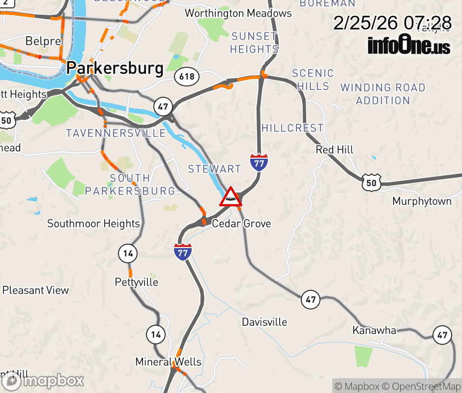 Vehicle Crash on WV-47 W. Staunton Trnpke @Mound St . The westbound road is closed. Updated: Wed 2/25/26 7:28 AM EST ![]() Updated: Wed 2/25/26 7:28 AM EST |