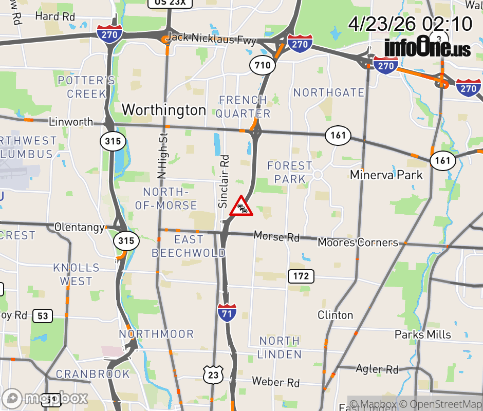 The 2 right lanes are blocked on I-71 South beyond SR-161/Dublin Granville Rd, due to repairs/maintenance. Updated: Thu 4/23/26 2:10 AM EDT ![]() Updated: Thu 4/23/26 2:10 AM EDT |