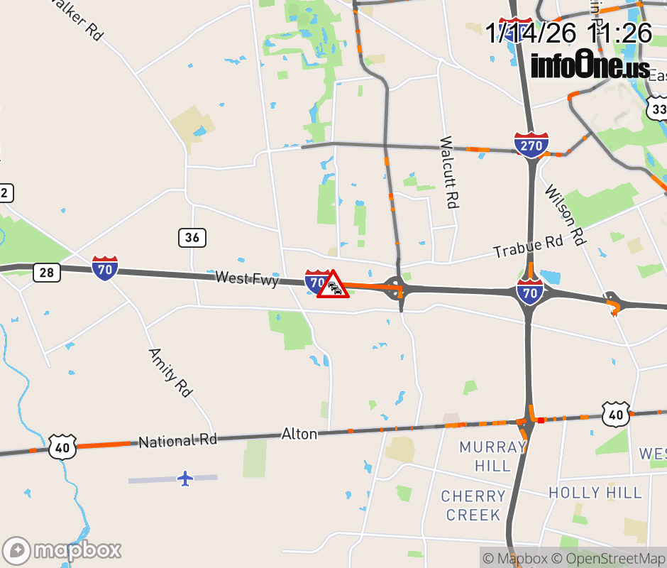 The right lane is blocked on I-70 West beyond Hilliard-Rome Rd South, due to repairs/maintenance. Updated: Wed 1/14/26 11:26 AM EST ![]() Updated: Wed 1/14/26 11:26 AM EST |