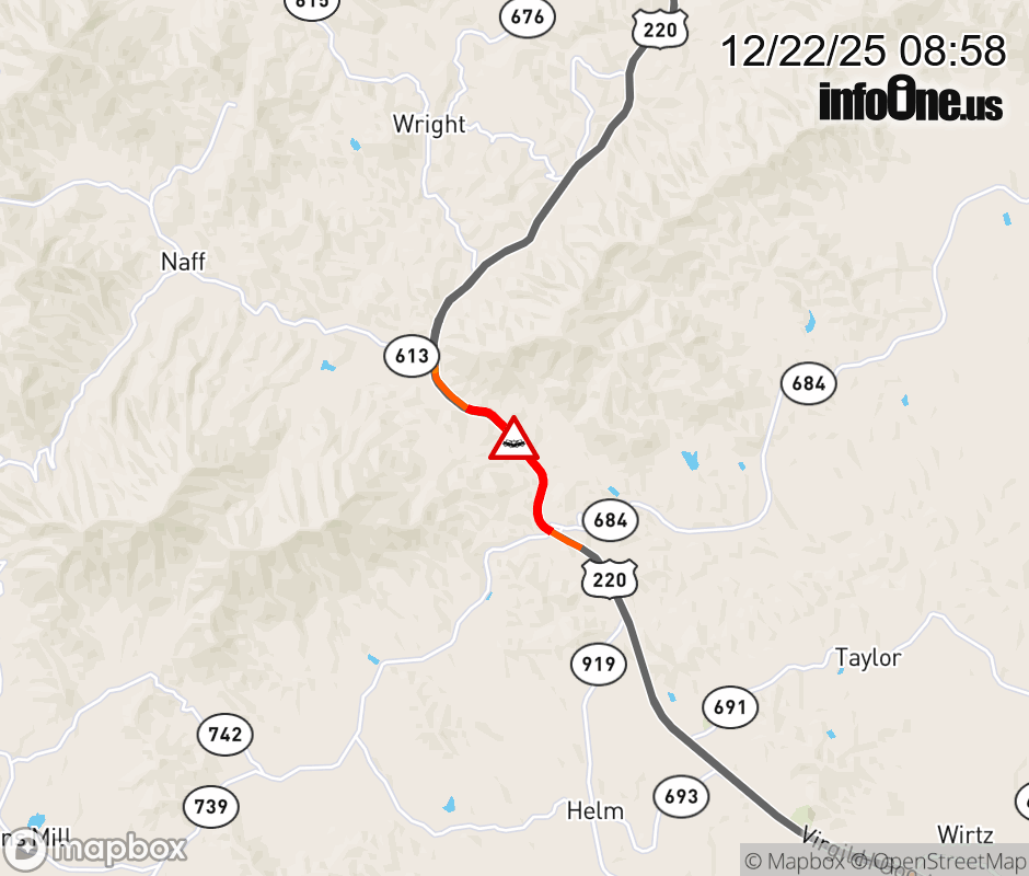 On US-220 in the County of Franklin, in the vicinity of Murray Knob Rd; Rt. 824N/S (Franklin County), motorists can expect delays due to a vehicle crash. The north right lane and right shoulder are closed. Updated: Mon 12/22/25 8:58 AM EST ![]() Updated: Mon 12/22/25 8:58 AM EST |