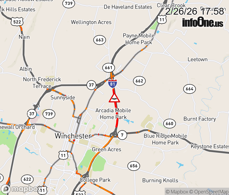 On I-81 at mile marker 317 in the County of Frederick, motorists can expect delays due to a tractor trailer crash. The south right shoulder is closed. ![]() |
