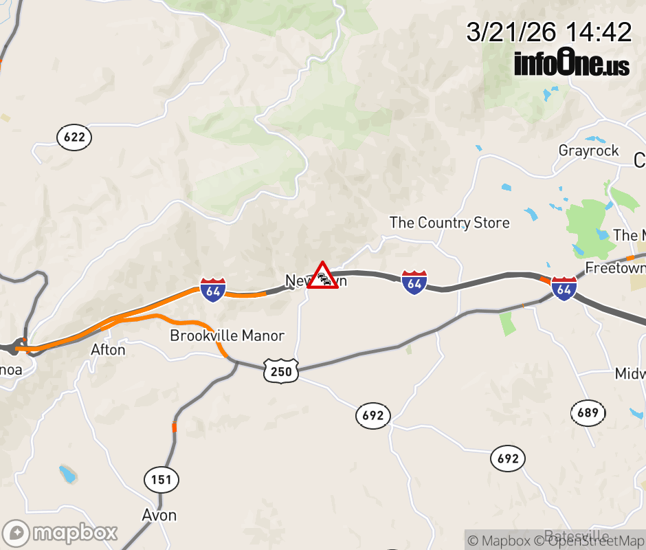 On I-64 West at mile marker 104 in the County of Albemarle, motorists can expect delays due to a brush fire. Traffic backups are approximately 1.0 mile. Updated: Sat 3/21/26 2:42 PM EDT ![]() Updated: Sat 3/21/26 2:42 PM EDT |
