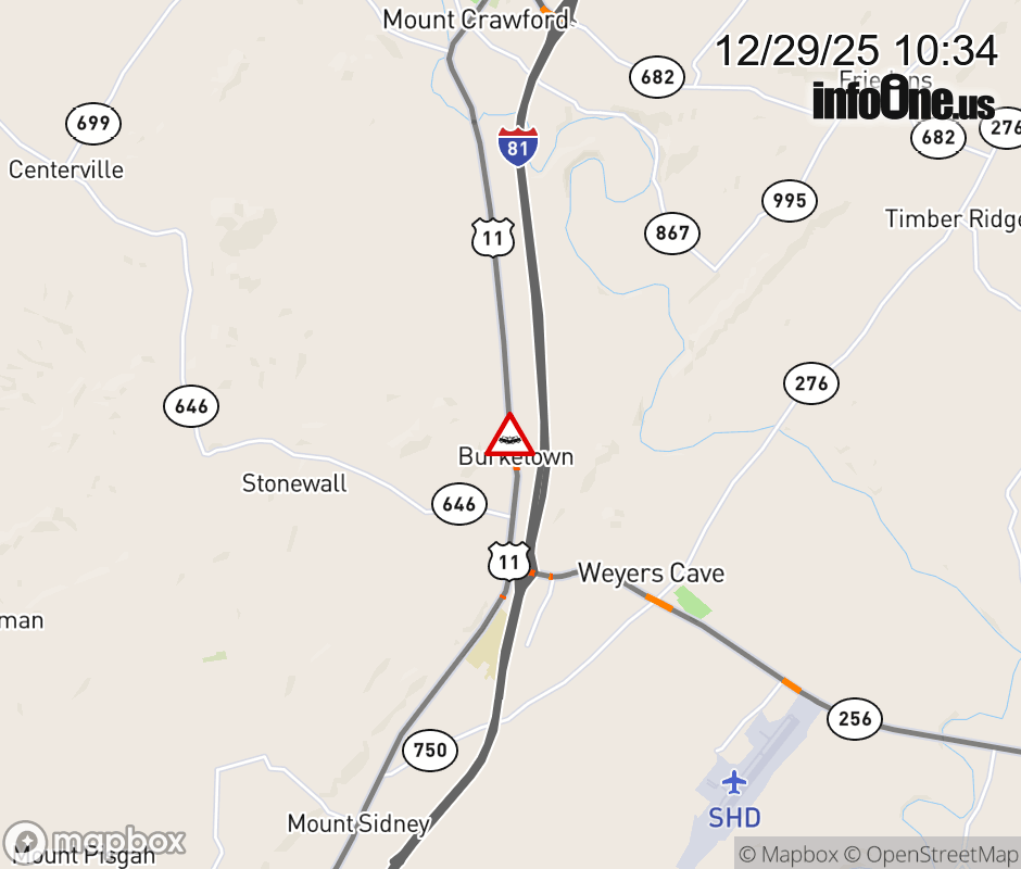 On US-11 in the County of Augusta, in the vicinity of Burketown Rd; Old Burke Mill Rd; Rt. 680E/W (Augusta County); Rt. 680E (Augusta County), motorists can expect delays due to a vehicle crash. All south lanes are closed. ![]() |