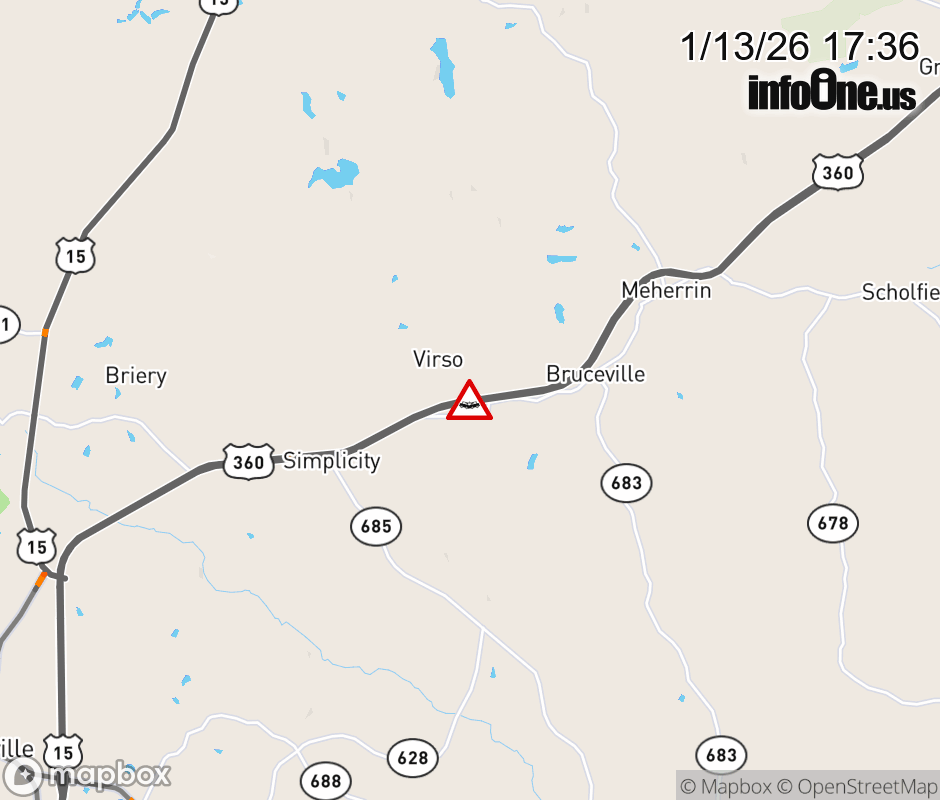 On US-360 in the County of Prince Edward, in the vicinity of Virso Rd; Rt. 633N/S (Prince Edward County), motorists can expect delays due to a vehicle crash. The east right lane and right shoulder are closed. ![]() |