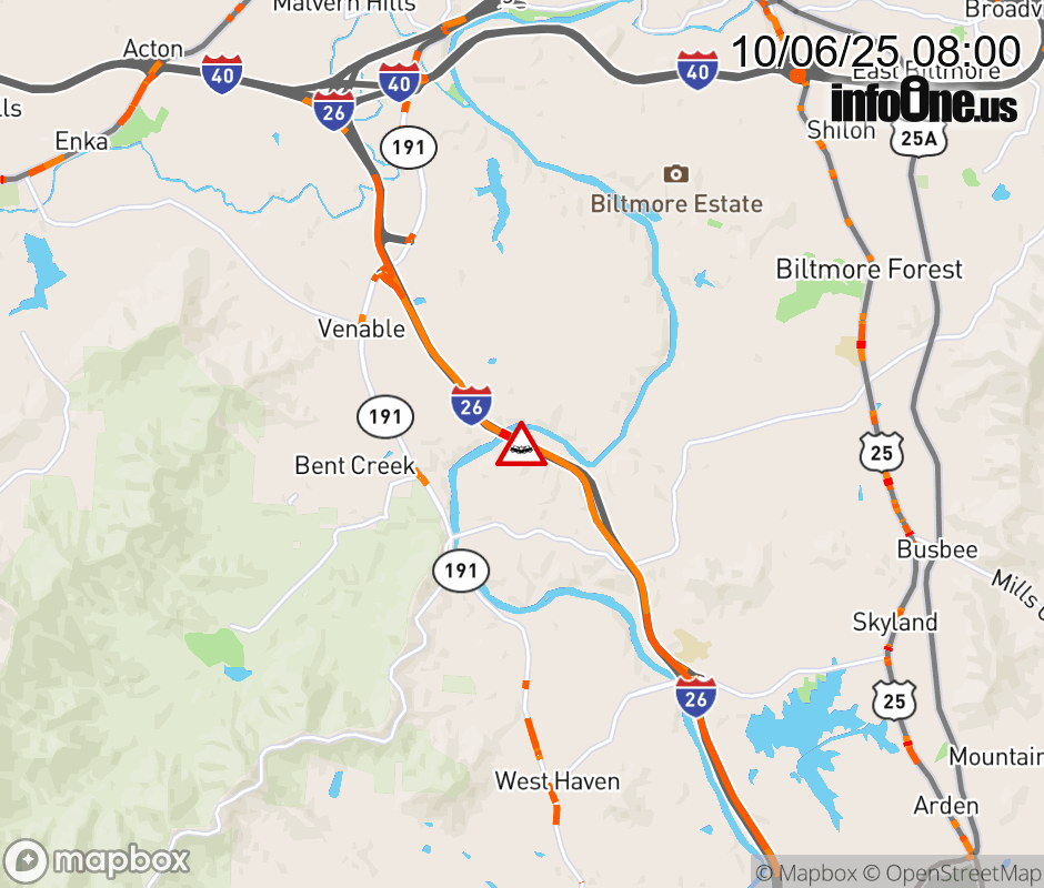 The right shoulder is closed 2 miles after Exit 33, NC 191 (Brevard Road). Updated: Mon 10/6/25 8:00 AM EDT ![]() Updated: Mon 10/6/25 8:00 AM EDT |