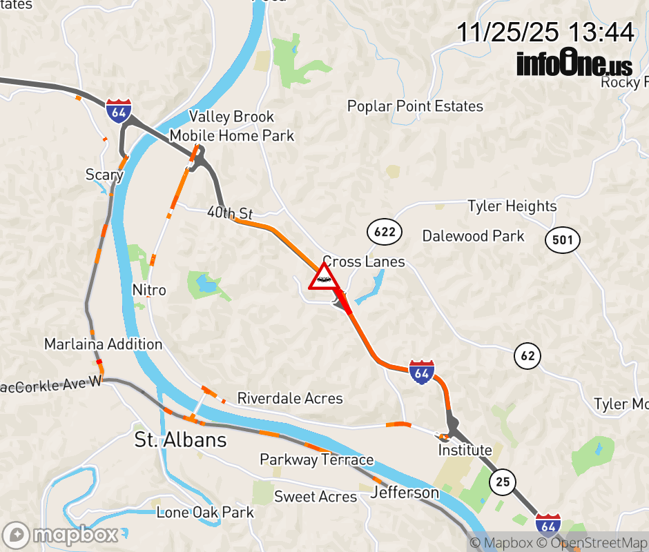 Vehicle Crash on I-64W at Mile Marker 47.0. Updated: Tue 11/25/25 1:44 PM EST ![]() Updated: Tue 11/25/25 1:44 PM EST |