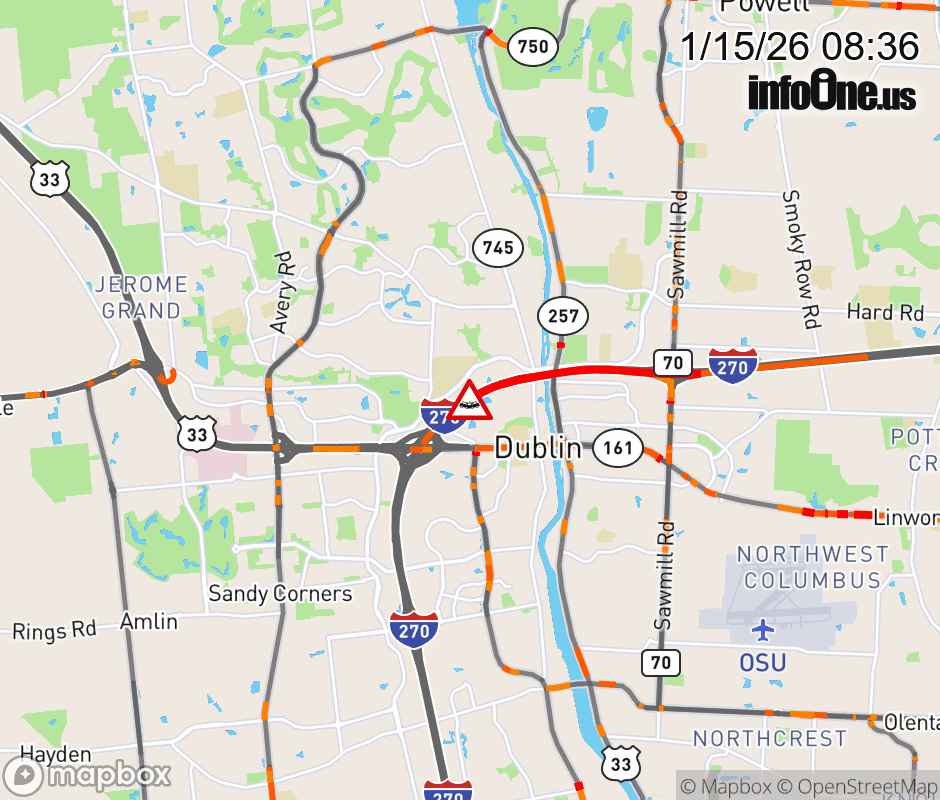 The right lane is blocked on I-270 East beyond US-33/SR-161, due to a crash. ![]() |