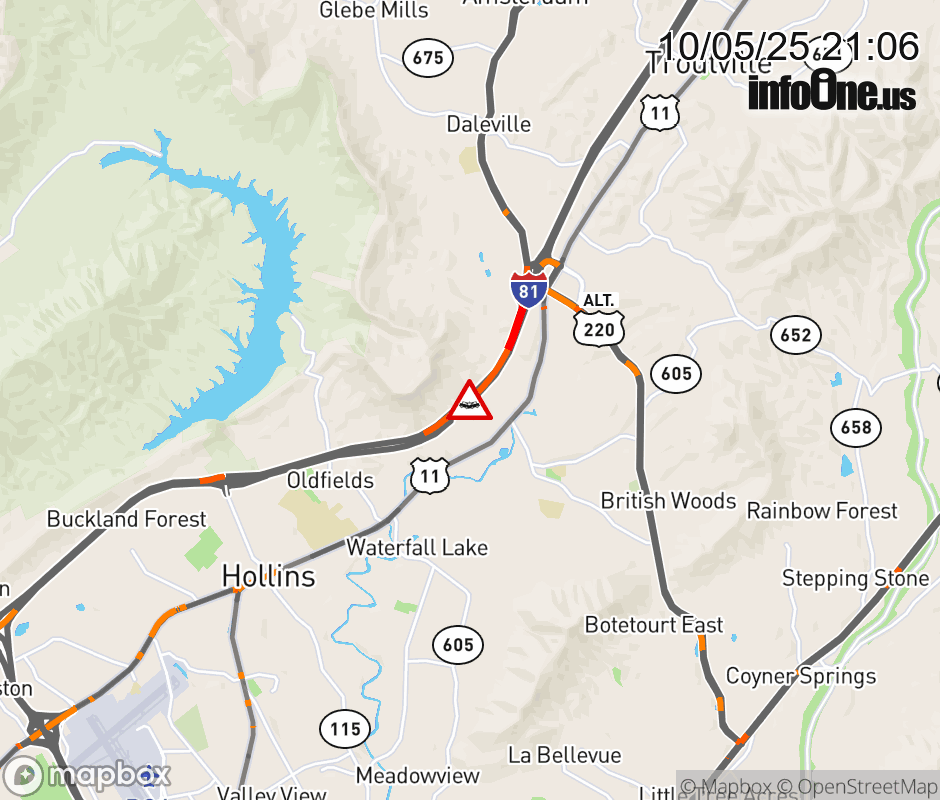 On I-81 at mile marker 149 in the County of Botetourt, motorists can expect delays due to a vehicle crash. The south left shoulder is closed. Traffic backups are approximately 1.0 mile. Updated: Sun 10/5/25 9:06 PM EDT ![]() |