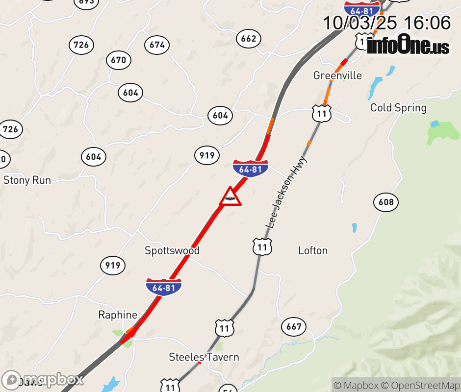 On I-81 North at mile marker 208.4 in the County of Augusta, motorists can expect delays due to a multi-vehicle crash. Traffic backups are approximately 3.5 miles. Updated: Fri 10/3/25 4:06 PM EDT ![]() Updated: Fri 10/3/25 4:06 PM EDT |